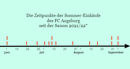 Auch unabhängig von großen Sommer-Turnieren gilt der FCA indes ohnehin als ein Verein, der nicht gerade für seine Raketenstarts in Sommer-Transferfenster bekannt ist. Richtet man den Blick etwa auf die vergangenen drei Sommer-Transferperioden, so fällt auf, dass Neuzugänge an der WWK-Arena häufig erst ab Juli anzutreffen sind.
